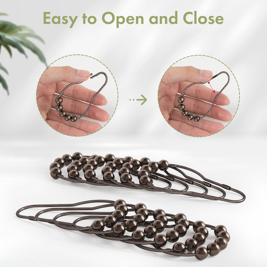 Rust-resistant stainless steel – The heavy duty brass and stainless steel construction allows years of use in the harsh bathroom elements. The 100% pure stainless steel, non-magnetic metal is corrosion-free, meaning it will last indoors and outdoors without rusting. Rust-resistant plated and polished – The steel is plated with rust-resistant material and polished with a bronze finish. The bronze shower curtain hooks looks classical, adding a very elegant look to any bathroom. Free gilding action - No snagging; no effort; no hassle. These bronzer shower curtain rings feature specially engineered spherical balls to reduce friction and allow effortless gliding across the rod with virtually no effort at all. Heavy duty closing hooks – The hooks are strong enough to hold a heavy curtain. They are sealed shut, making it impossible for the curtain to slip off the rings. Set of 12 - Sold as a set of 12 for a standard 60 or 72 inches opening.