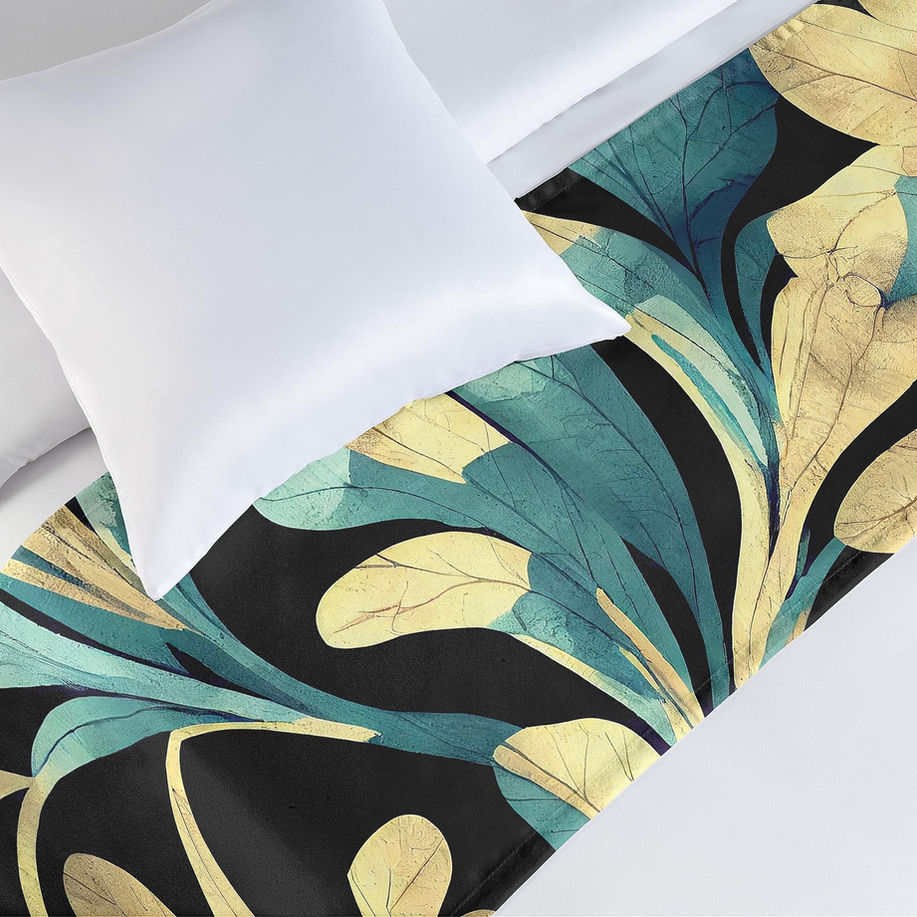 For twin size bed - 68 inches wide & 19.5 inches long. Bed scarf for foot of bed. Made in Turkey. Made from - High-quality 100% polyester satin fabric. Durable and soft feeling. For bedroom decor. Features - Protect your bed from dust & stains. Creates a decorative accent. Comfortable for pets. Machine washable - On cold cycle. Tumble dry, on low. For bedrooms, hotel rooms or guestrooms. Printed - With state of the art digital printing technology. Long-lasting bold colors & clear image.