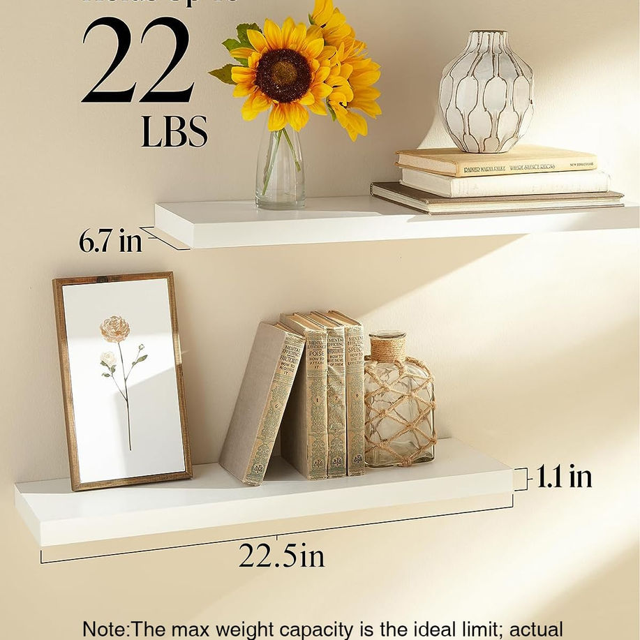 Modern & Simplistic - Create a personalized display with our sleek wooden floating shelves that offer a contemporary design Versatile Design - These shelves can be easily placed in any room, from your cozy bedroom to your functional kitchen or home office Protection Sealing - Each shelf is treated with a protective sealant to prevent warping or damage Increased Load-Bearing - Our shelves can hold up to 22 lbs, allowing you to display your favorite objects with confidence Larger Size - Measuring 22.5 inches in length, our shelves provide ample space for both storage and decoration