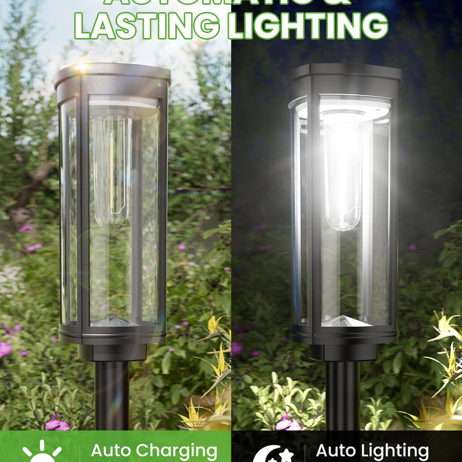 BRIGHT SOLAR OUTDOOR LIGHTS: Experience the mesmerizing cool white glow of BITPOTT solar pathway lights. With a high transparent lens design that enhances light transmission, they are brighter and more beautiful than ordinary outdoor solar lights. These waterproof solar powered landscape lights can project unique light and shadow, creating a romantic and warm atmosphere for your home. LONG-LASTING SOLAR LIGHTS: Unlike typical solar walkway lights, BITPOTT solar garden landscape lights are equipped with a powerful rechargeable 3.7V/1.85WH battery. This enables them to provide illumination for up to 10-12 hours after a full charge and automatically turn on at night. This ensures you have bright and reliable lighting throughout the night. UNIQUE & RETRO DESIGN: The bright solar pathway lights outdoor feature warm white tungsten filament bulbs placed within high transparency, thicker lampshades, making BITPOTT solar yard lights brighter and more durable than others. These waterproof solar powered landscape lights can project unique light and shadow, creating a romantic and warm atmosphere for your home. ALL-WEATHER RESISTANT & EASY TO INSTALL: The outdoor solar yard lights boast a high waterproof level of IP65, ensuring resistance to all types of weather conditions, including rain, snow, frost, and sleet. Installation is effortless; simply connect the stake, pole, and solar light, then insert the solar lights into the ground or lawn where they can receive ample sunlight for optimal lighting. WONDERFUL GARDEN DECOR: Illuminate your garden with the enchanting glow of BITPOTT solar-powered path lights! Perfect for gardens, yards, pathways, lawns, flower beds, driveways, patios, porches, and walkways, these solar lights outdoor bid farewell to dull evenings and relish your garden with family and friends as the sun sets. Note: Pull out the solar panel upwards, turn the switch to "ON", then install the solar path light and place it in the sun to charge automatically.