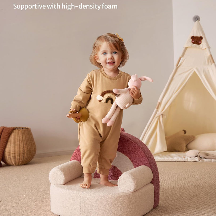 Comfy Kids Chair: It comfortably supports your toddler with a perfectly sized seat, proper height and rounded armrests, making sitting a true pleasure. A toddler essential for reading, playing, or just snuggling. Ideal for ages 18 months and older Lightweight and Portable: Kids love having their own chair! Designed with a kid-friendly handle, this lightweight foam toddler chair is easy for little ones to drag around the house. Simply grab, go, and get cozy wherever they please Sturdy High Density Foam and Washable Cover: Every time your child sits down, it's like soaking in a cozy hug, surrounded by cushiony high-density memory foam and skin-friendly, soft teddy fleece. The cover zips off for easy machine washing Rainbow Fun and Perfect Gift: Color your kid's room with this cute rainbow toddler chair, bringing a sense of luck and happiness every day! The unique playful design will be a hit with kids. An exciting gift for Christmas, birthday, or Children's Day Pre-Assembled: Our toddler armchair is vacuum-packed and pre-assembled. Just open and wait for full shape. You will get a cute and comfy child chair