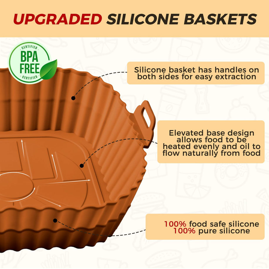 đăHeat Resistant & Food-Safeă- The air fryer silicone liners are made of safe food-grade silicone, BPA free, Non-toxic, Non-stick, scratch, abrasion, tear, dirt resistant and high-temperature heat resistant up to 428 â (220â), perfect replacement of flammable disposable parchment paper liners. Our silicone air fryer liner is reusable, will not deform or damage after hundreds of uses, it is the most valuable air fryer accessory. đăPerfect Fits All 3.6QT- 6.8QT Air Fryeră- The diameter of air fryer liners silicone: 8inch, height: 2inch. Suitable for 8inch baking tray basket and above and all 3.6-4.2-6.8QT air fryers, compatible with Gourmia, Ninja, Phillips, Nuwave, Gowise, Dash, Cozyna, Cosori, Ultrean, Vremi, power XL air fryer. This air fryer oven accessories can also be used in oven,microwave, pressure cooker or food placement. đăEasy Cleaning & Dishwasher Safeă- These air fryer accessories are are very soft, flexible and non-stick, you just pour out food residues and dirt to flip it over inside-out and wash it with warm water. No more cleaning the air fryer basket, Keeps your air fryer free from food residue, grease, and grime without compromising the life span of your airfryer. Completely dishwasher safe, allowing you to avoid the trouble of hand washing. Say goodbye to sticky and burned residue! đăPractical Designă- The reusable air fryer silicone pot have many raised lines, which improve the circulation of heat to fully heat the food for a more even doneness. Keep your bacon, breads, pizza, turkey, fries, buns integrity and nice look, and no effect on the taste of the food. Our silicone air fryer pot are designed with intimate handles on both sides to protect your hands from burns when removing the silicone pot. They are great kitchen air fryer accessories. đă Wide Applications ă- Reusable air fryer silicone basket (instead of parchment paper liner) is not only suitable for air fryers, but also can be used for microwave oven baking, barbecue frying, steamer lining or food placement. Suitable for everyday home kitchen baking, going out camping, friends gathering barbecues, rave parties and more. The perfect gift for your family, friends and cooking lovers.