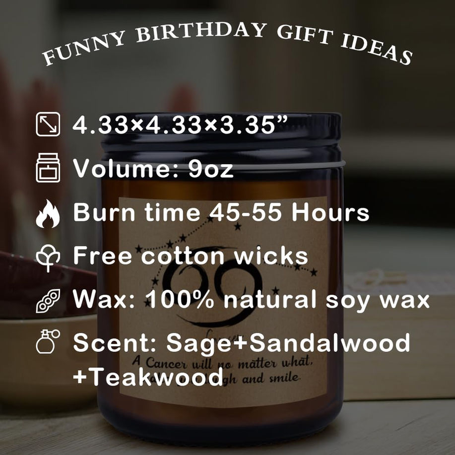 Gifts for Astrology Lovers: Unique horoscope candles are a great addition to collection of Cancer stuff. Astrology candle Cancer birthday gifts for women and men will love. A true Cancer - infused with perceptive, determined and emotional. This candle offers a lively, many-sided scent of a natural Sage, Sandalwood and Teawood perfect for the passionate, mysterious, and negative energy souls born on this date. Give the gift of velvety smells to best friend with our Cancer gifts. Funny Birthday Gifts for Women and Men: This is a great funny gift ideas for a scented candle with a humorous quote. Funny gifts, Cancer gifts women, christmas gifts for women, gifts for mom, best friend gifts for women. If you love this candle, share the love and give the cool gift for mother, sister, boyfriend, girlfriend, bestie, bff, coworker, female, naughty, fiance, bride, boss. Gifts for Any Occasion: Gag gift for birthday, Christmas, White Elephant, long-distance friendship, bday, thanksgiving, sympathy, anniversary, engaged, moving away, graduation, coworker leaving, new home owner, hostess. Housewarming gifts, valentines day gifts, mothers day gifts, christmas gifts, stocking stuffers gifts, friendship gifts, engagement gifts, get well gifts, thank you gifts, thinking of you gifts or any gifting occasion. Home Soy Wax Scented Candle: The perfect handmade natural soy candles horoscope gift for the astrology lover. Perfect soy candles contain 9 oz of 100% natural soy wax, using high quality premium fragrance oils to relieve pain and promote sleep. The heartfelt gifts for Cancer women and men is a perfect addition to you apartment, bathroom, bedroom, kitchen, living room, office etc or home decor. Unique Candle Gifts Friends; A unique candle gift ideas for best friends who loves candles. Fun zodiac Cancer gifts for women are carefully packed in an elegant gift box and chosen to make a lasting impression. The candles gifts with great humor and quality can set a great mood. This birthday gifts for women would make a nice gift for those hard to buy Cancer friends and family members.