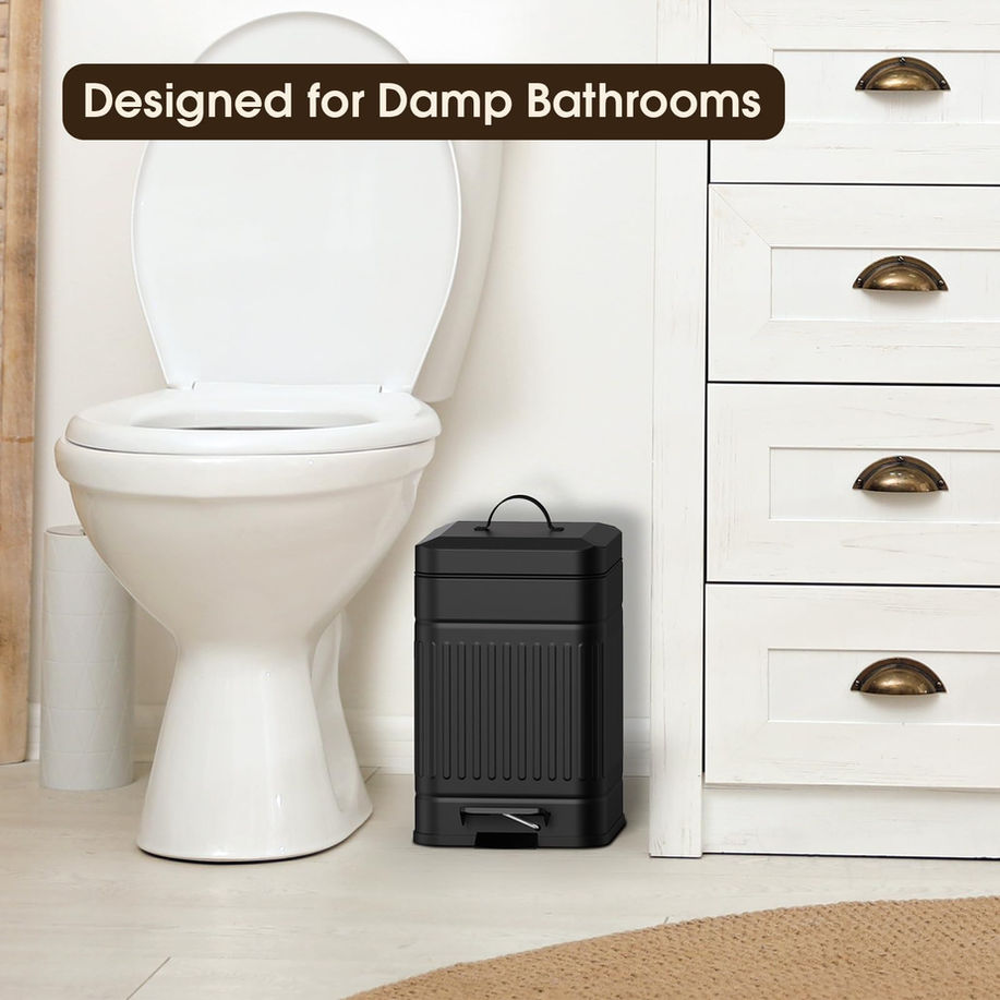 Silent Soft Close: The step trash can has a damper arrangement that retards the close of allows the lid to close quietly and safely by itself every time, don’t worry about disturbing the rest of your family Retro Design: This Rectangular Metal trash can is the perfect vintage garbage can specially designed with an Embossed body and matte finish; Looks sophisticated and retro whether used in farmhouses, bathrooms, bedrooms, offices, toilets, dorms, etc High-Quality Material: this trash can is made from stainless steel can, thick and durable, and anti-fingerprint; The inner barrel is made of pp material Removable Inner Bucket: The stainless steel trash can has a plastic liner bucket with a handle and can be easily lifted out for easy dumping of garbage and rinsing quickly when needed; There is a handle on the back of the trash can to move it easier Odor-Free: This Dog Doop trash can has a lid and double-layer design, odor can't escape. It can be easily opened and closed by simply the pedal of the trash can; Creates a perfect seal with no trash bags showing for a clean look