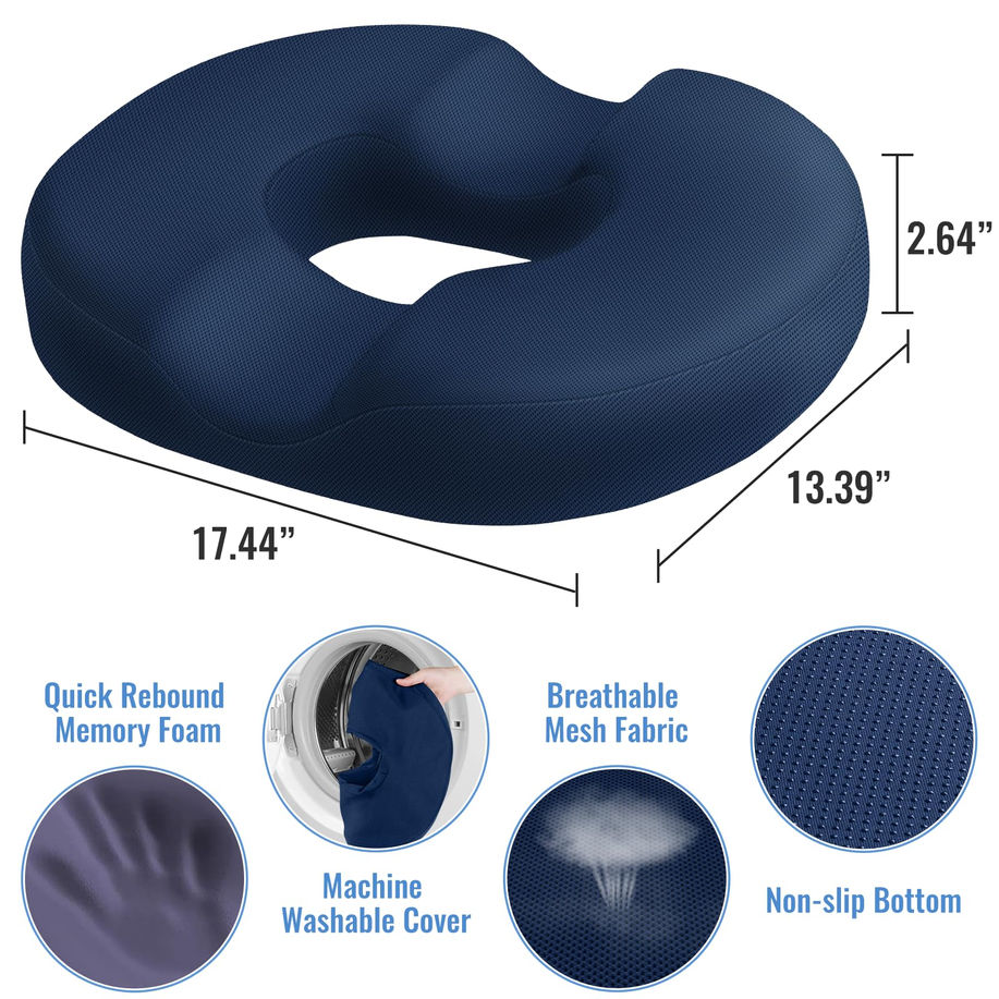 [Suitable Size] CloudBliss donut pillow measures 17.44" x 13.39" x 2.64". The donut pillow can be taken anywhere, and can be used for any type of chair, such as wheelchair, office chair, airplane, car, bleachers at games, dining chair, etc. Its portable and lightweight design allows you to take it with you wherever you go, ensuring you never have to compromise on your comfort [Ergonomic Design] CloudBliss tailbone pain relief seat cushion features an ergonomic "U" shaped gap and center hole that evenly distributes weight, reducing hip pressure when in use and effectively reducing pressure on the tailbone, thus alleviating hemorrhoidal pain and relieving discomfort caused by sitting for long periods of time. Ideal for pregnant women, post-surgery recoveries, office workers and more [Benefits for Hemorrhoid Sufferers] For individuals suffering from hemorrhoids, daily activities can feel like a constant struggle. The pain and discomfort associated with this condition can make sitting for extended periods unbearable. CloudBliss donut pillow for tailbone pain provides the necessary support and comfort to alleviate the pressure on sensitive areas, allowing you to sit without aggravating your hemorrhoids [Relieve Sedentary Discomfort] Whether you have a desk job or spend long hours sitting, sedentary discomfort is a real issue. Prolonged sitting can lead to a variety of health problems, including lower back pain, hip pressure, and even sciatica. CloudBliss donut pillow is your answer to finding relief from these issues. Its innovative design distributes weight evenly, reducing pressure on the spine and promoting proper posture [Thoughtful Gift] This donut chair cushion is as soft as well as breathable, with good support and not easy to deform. If you give the tailbone pain relief cushion as a gift to your family, friends, boss, clients and coworkers, they will love it and will thank you for giving the gift of comfort