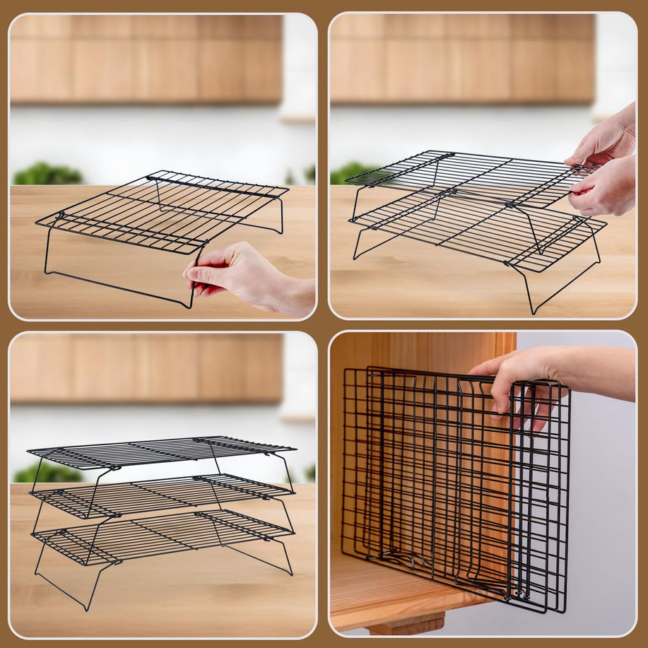 SUPERIOR QUALITY: BRIOUT cooling rack is made of solid stainless steel which is durable and resistant to bending and rust. The grid are firmly welded to serve food steadily. EXPANDABLE: The wire baking rack with flexible feet can be easily stacked in 3 tiers or each tier can also be used separately, allowing you to cool cupcakes, cookies and pies all at once without taking up extra place. TIME SAVING: Proper grid spacing and unfolded supporting feet offers entire racks maximum air circulation which fasten cooling time and ensure best baking results. COLLAPSIBLE: The stackable cooling racks for baking can be folded compactly. Just hang it on the wall or put it in cupboard for easy storage and save your countertop space after using. VERSATILE: Our cooking rack is perfect for baking, cooling, roasting and dehydrating. Non stick surface ensures baked foods come off easily and easy cleaning.