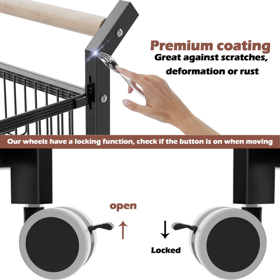 Solid wood Handle Design: this cart with solid wooden handle and 4 360-degree movable Universal wheel design (2 can be stuck)。Fruit basket is made of high-quality durable rustproof metal. The rustproof surface is with black coated finish. For sturdy and durability, not easy to deform. Detachable Structure: Each layer is a buckle structure and has 4 optional card holes, The spacing between each layer can be adjusted at will, It is more convenient to place items.Perfect for storage and display, enough for fruits, vegetables,kid's toy, food, snack, craft supplies, and so much more. Portable Mesh Design: The mesh grid design of storage trolley fruit basket allows air circulation and reduces dust build-up which ensures breathability. Can be easily disassembled, stacking doesn't take up space and easy to clean. Multipurpose Mobile Metal Storage Trolley: The storage trolley fruit basket can create vertical storage space wherever needed, such as kitchen, bedroom, playroom, garage or office, dorm, etc. Easy Assembly & After-sales Service: Package includes all the parts and the tool you need, follow the instructions inside, you will have no problem finish this with a couple of minutes.Your 100% satisfaction is our ultimate goal. Feel free to contact us if you have any problem with our product.