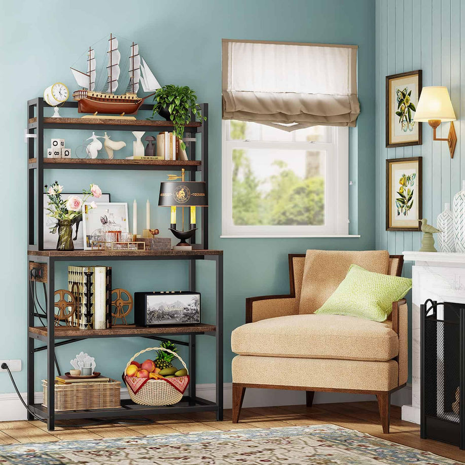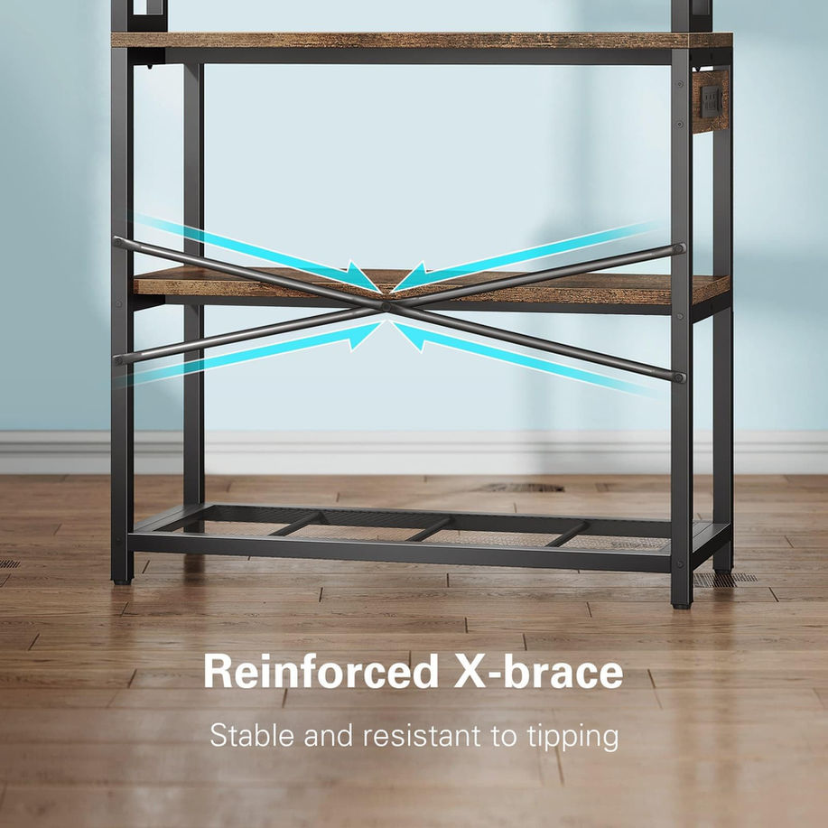 【Space Maximization】: The size of bakers rack with storage is 39.4×15.7×66.9 inch. The 39.4 inch width can enough store your microwave+coffee machine+juicer and 5-tier coffee stand design to store toaster, fryer, sauce bottles and any other household items. It also features a breathable grid layer at the bottom for fresh fruits and vegetables 【Convenient 3 Power Outlets】: Our microwave stand with storage not only come with 3 AC outlets and 6.56 feet of cord to power multiple appliances at once without having to move any of them, but also come with a safety switch to ensure electrical safety 【Durable and Sturdy】: Made from 15mm thick P2 particle board, kitchen rack boast sturdy construction and high-quality materials. It can hold items up to 33lb (top two layers), 66lb (bottom two plates), and 44lb (iron grid layer) 【Quick and Hassle-Free Assembly】: With a simple design and clear installation instructions, our microwave cart can be easily assembled in about 15 minutes. Each accessory is labeled for easy identification 【Versatile Placement】: Suitable for a variety of settings such as the kitchen, living room or balcony, it is perfect as a microwave oven stand, coffee bar station, kitchen stand, flower rack. This utility bakers rack with storage adds functionality and charm wherever it is placed