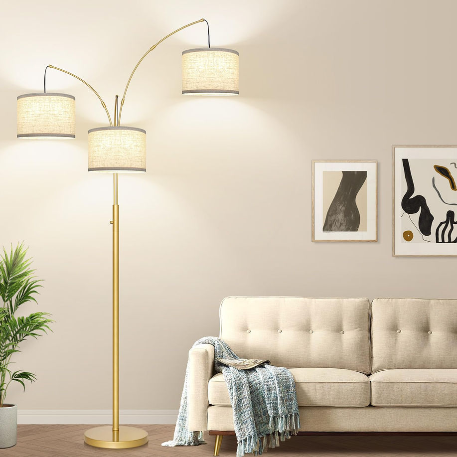 【Dimmable Floor Lamp】: This standing floor lamp offers adjustable lighting from 0-100%, making it easy to set the perfect brightness for your current task—whether you're watching TV in the living room or reading in your office. This standing lamp is very easy to turn on and off. Just simply twist it and then you can adjust the arc floor lamps brightness what you want 【Experience Elegant, Fashionable Design】: The 80" Height arc lamp has 3 lamp arms that can rotate freely 360° and 3 hanging lamp shades at different heights which direct the light precisely where you need it most, brightening up any corner. The floor lamp appears heavy and sturdy, with excellent quality shades made of thick linen fabric. The clean lines lend a simple yet refined look 【Easy to assemble]】: The modern floor lamp is simple to set up - just follow our installation. Everything needed is inside the package including 3 LED BULBS. In less than 10 minutes, you can have an elegant, beautiful floor lamp to complement your home 【Sturdy and Safe】: The floor lamp boasts high quality, with a very weighty base to avoid the risk of tipping, even in busy spaces or around curious pets and children. You can trust that our corner lamp puts you and your family's safety first 【36 Months Product Support & Customer Services】: We proudly offer 100% support for all our products because we always prioritize customer satisfaction. If your lamp has any defects or ceases to function within 3 years, we'll assist you in troubleshooting or send a brand-new product. (If you encounter any issues with our standing lamp, please be sure to inform us, and we'll promptly reach out to assist you)