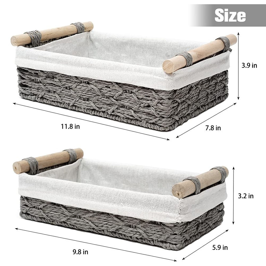 1.Great Handmade Storage Basket:This storage bins is all handmade with paper rope custom.Each knot takes our workers a long time to weave.So it's a perfect gift that is completely handmade. 2.Creative gifts:When you don't know what to give as a gift,it will be a great idea.It can be a gift basket for you friends or family.Your friends or family will absolutely love this creative gift.It will be the perfect finishing touch to your home. 3.Multiple-use Storage cubes:This storage basket not only can be used in your bathroom it also can be used in living room, guest room, kitchen, office etc.All the miscellaneous things in daily life can be used for storage use this basket. 4.Compact storage basket DESIGN: The tank tray neatly fits on top of toilet tanks for a handy place to stash bathroom toiletries and accessories so you or guests have extra necessities easily visible and at your fingertips; Raised sides keep items contained; Slim design allows this basket to be easily stored in cabinets or on dresser tops; Great for jewelry, smartwatches, bracelets, rings and necklaces; Try it on your office desk to keep pens, pencils, tape, scissors, and other supplies organiz 5.Product size:11.8*7.8*3.*9 inche,9.8*5.9*3.2inche