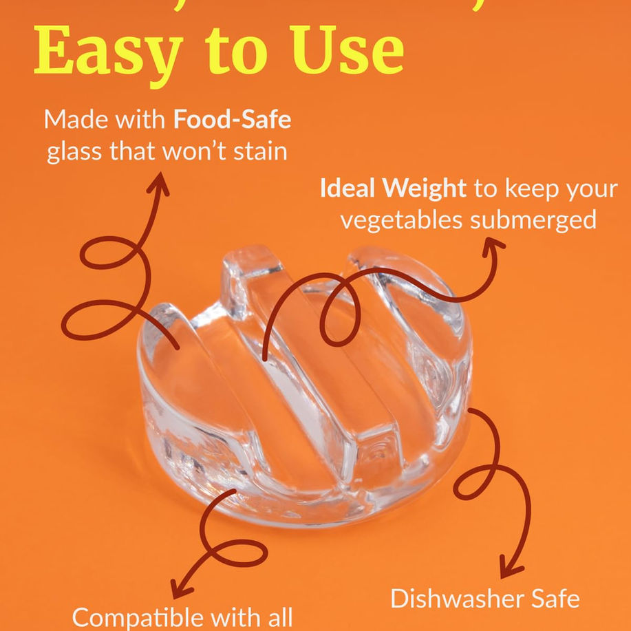 FOOD-SAFE GLASS – Made from the highest quality, food-safe soda lime glass, Elementi's durable glass fermentation weights ensure a pure and natural fermenting process. Non-porous and lead-free, they won’t stain or retain odors, keeping your food’s flavors fresh and authentic with every use. THE KEY TO PERFECT FERMENTATION – Achieve flawless fermentation with ease! Elementi's expertly engineered sturdy glass weights for fermenting keep your vegetables fully submerged, preventing spoilage and delivering consistently delicious results for kimchi, sauerkraut, pickles, and more. FITS WIDE MOUTH MASON JARS – Engineered for a perfect fit in all wide-mouth mason jars, including Ball jars, the Elementi mason jar accessories make fermenting even more enjoyable. With a 2.7" diameter, they are the perfect fit for turning any wide-mouth jar into a fermenting kit. EASY TO GRIP & RETRIEVE – Our easy grip handle makes retrieval a breeze, whether using your hand or a fork. The easy grip bar handle ensures a smooth, hassle-free experience from start to finish. DURABLE & DISHWASHER SAFE – Built tough for long-lasting use, these weights are easy to clean and dishwasher safe. Enjoy years of reliable performance, knowing your food will stay submerged and your fermenting projects will turn out perfectly every time.