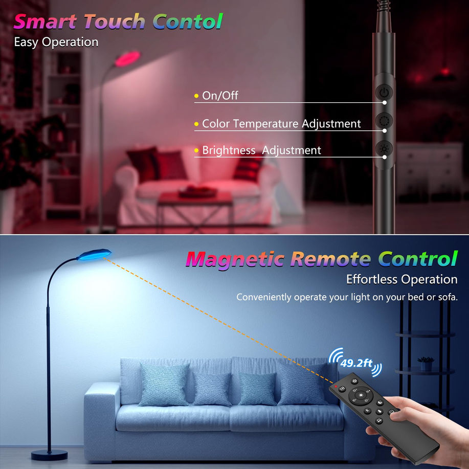 Vibrant RGB Illumination: Enhance your space with our RGB floor lamp, delivering a stunning range of dynamic color effects. Whether you're setting the scene for a party or creating a calm and cozy ambiance, this lamp adds energy and vibrancy to any setting 18W Ultra-Bright: Light up your entire room with the powerful 18W output and 1800 lumens of brilliance. Designed for eye protection, this tall lamp delivers soft, glare-free illumination, reducing eye strain for enhanced comfort and safety Stepless Dimming: Adjust the brightness (10%-100%) and color temperature (2700K-6500K) seamlessly with this bedroom floor lamp. Whether you need a warm, cozy glow for reading or bright, crisp light for working, you can customize the lighting to suit your needs perfectly Dual Control Options: Operate your modern corner floor lamp effortlessly using the remote or touch control. The remote features dedicated reading and night light modes for one-touch convenience. Plus, its magnetic design allows it to attach to the lamp for easy access Flexible Gooseneck, Adjustable Angle and Height: The 360° adjustable flexible gooseneck up to 13.8 inches, which allows its height can be adjusting by varying the angle of the gooseneck and direct the light exactly where you need it. Featured with a distinctive "Diamond" shape lamp head and sleek morden design help your floor lamp blending in with your home/bedroom/living room/office decor