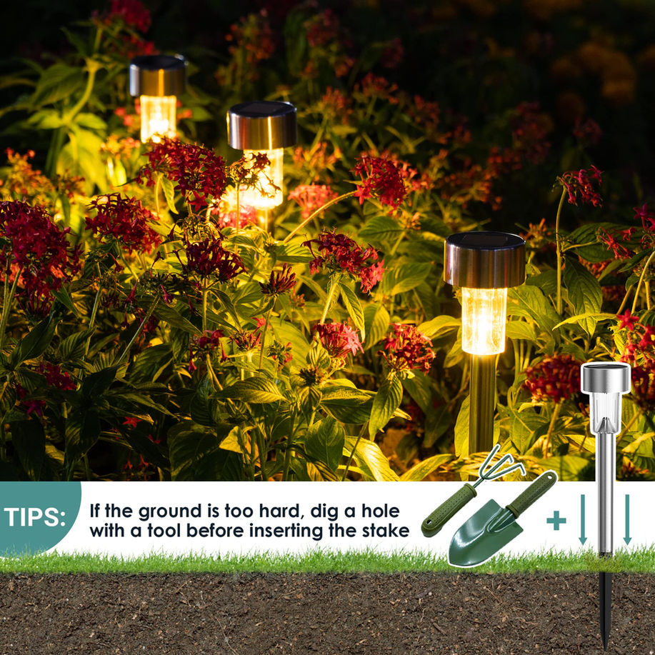 Effortless Energy Efficiency: Our solar pathway lights automatically charge during the day and turn on at night, saving energy and extending battery life Weather-Resistant Design: Made with durable stainless steel and ABS material, our outdoor ground lights are built to withstand rain, snow, and other harsh weather conditions Illuminate Your Outdoor Space: Our solar lights are bright and beautiful, adding a touch of elegance to your garden or yard. Enjoy excellent value for your money with their stunning light patterns Easy To Assemble: No tools required! Simply flip the switch and insert the solar garden lights into the ground. For best results, dig a small hole first After-sales Service: We're committed to providing you with the best possible service. If you have any questions or concerns about our solar outdoor lights, please don't hesitate to contact us. We're here to help