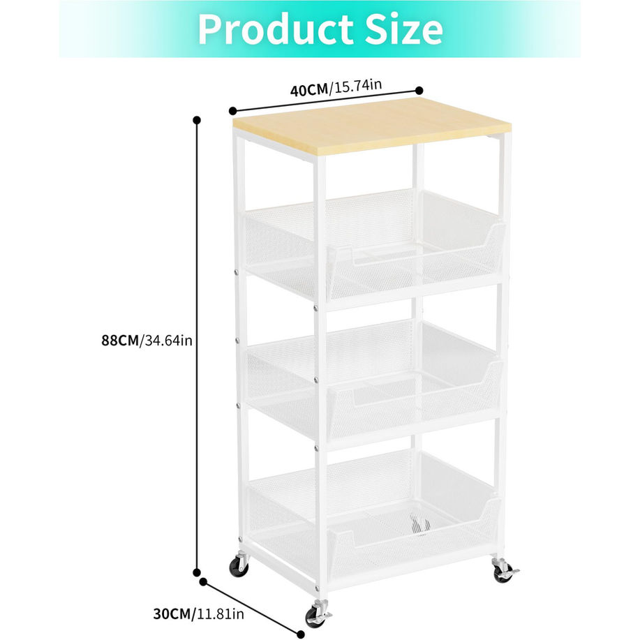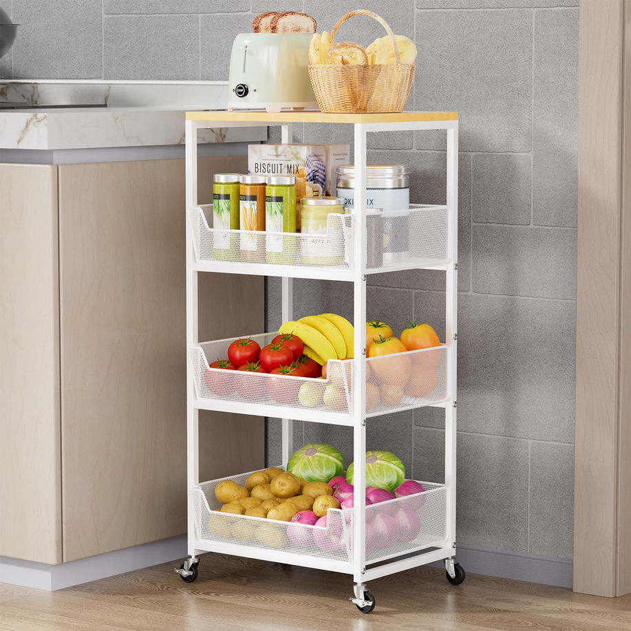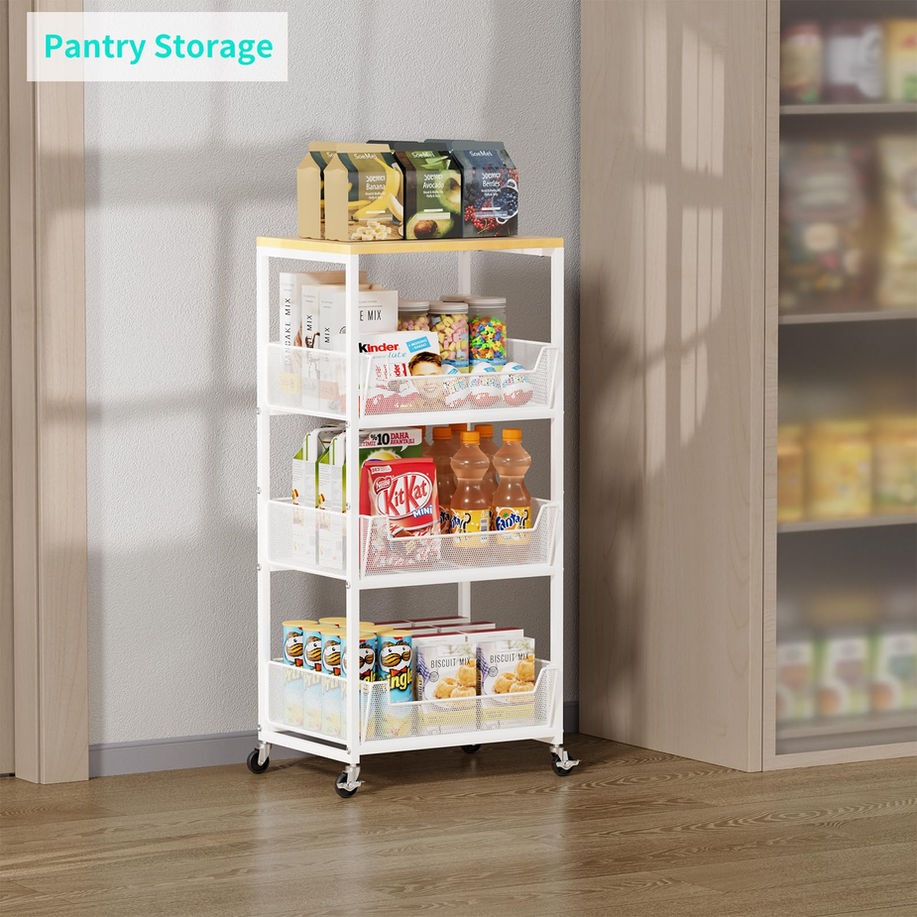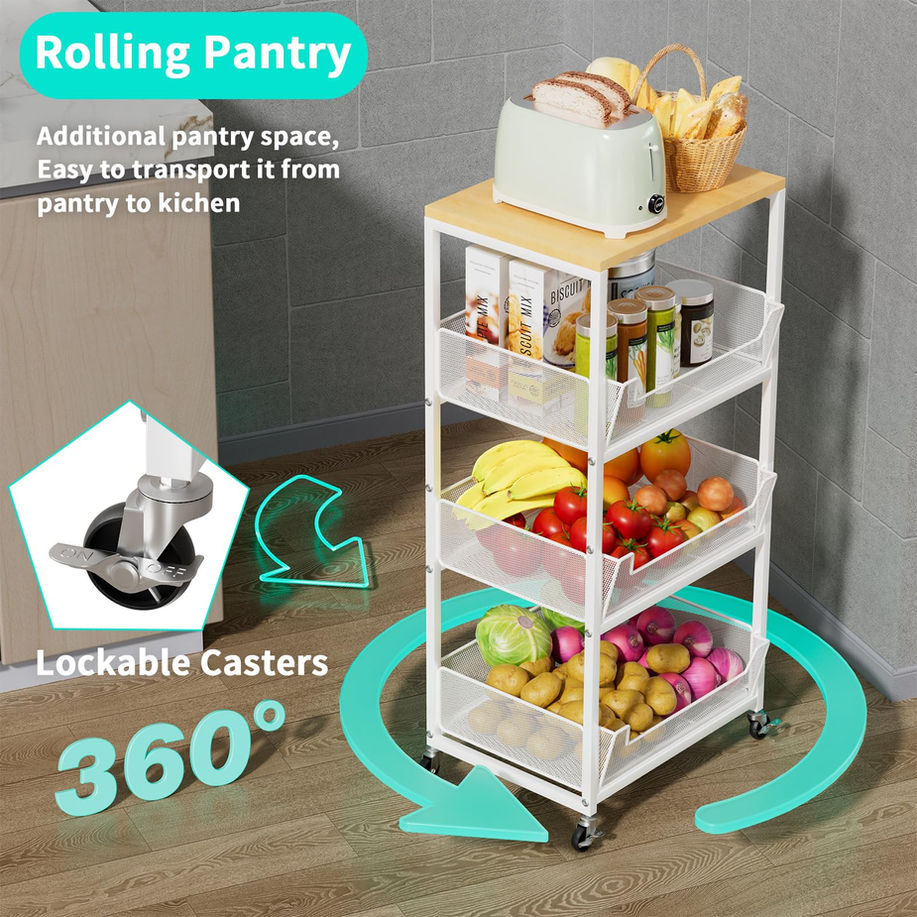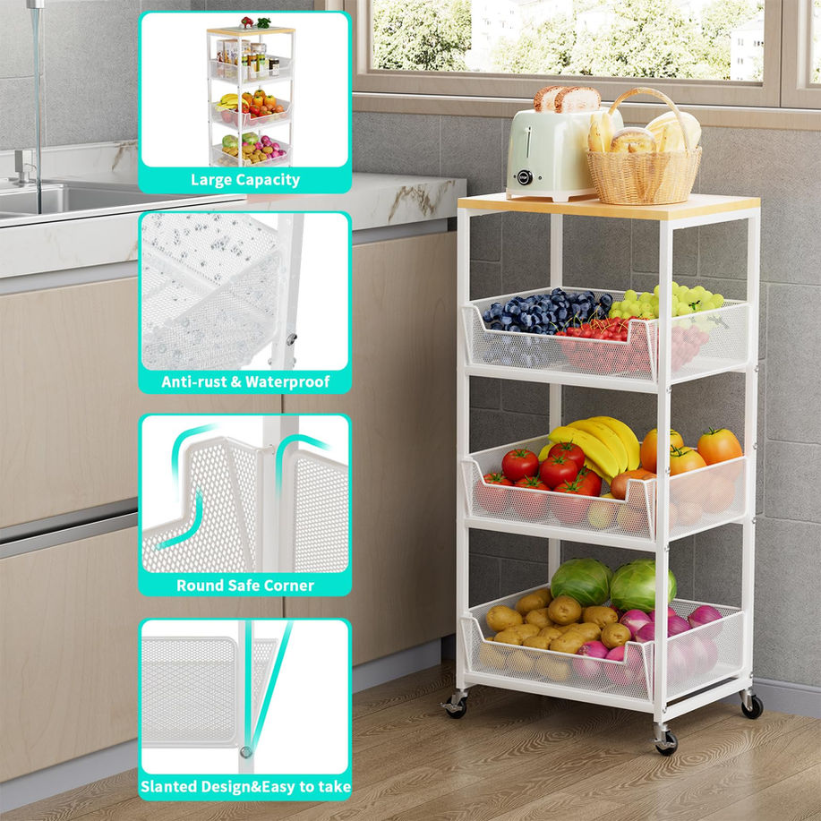 [Wood Top for Extra Storage]: Enhance your kitchen's functionality with the solid wood top, providing a stable surface on the kitchen cart for essentials like pots, pans, or spice jars. This feature adds style and space-saving functionality, perfect for keeping your fruit basket for kitchen organized in any kitchen setup [Fine Mesh Design for Small Items]: The fine mesh wire baskets on this snack cart are perfect for storing berries, small fruits, or herbs, ensuring that even the smallest items stay securely in place. This thoughtful design makes your snack organizer for pantry shelf an ideal choice for handling delicate kitchen produce with ease [Multifunctional Storage Carts]:This fruit basket isn't just for storing fruits and vegetables, it's also versatile enough to organize farm produce, snacks, toys, beverages, towels, and various items. Our standing kitchen rack floor are perfect vertical storage assistant for kitchens, pantry, bedrooms, living rooms, laundry rooms, bathrooms, garages, offices, and more [Large Capacity for Maximum Storage]: With its 4-tier design, this kitchen shelves offers plenty of space for storing everything from produce to kitchen gadgets. The large-capacity baskets make it easy to keep your kitchen organized, ensuring that your kitchen storage cabinets is always stocked and accessible [Tilted Baskets for Easy Access]: The tilted basket design on this kitchen storage cart allows for quick and easy access to your stored items. Whether it’s fruits, vegetables, or other essentials, the angled baskets ensure that your fruit and vegetable storage cart is both convenient and stylish for everyday use