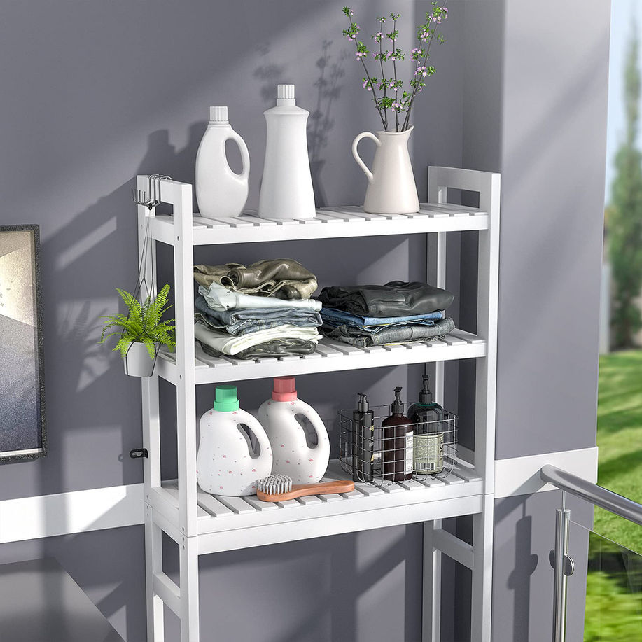UTILIZE LIMITED VERTICAL BATHROOM SPACE - The perfect pick for small bathrooms, a 3-tier freestanding over the toilet storage unit helps keep your toiletries organized without taking up too much floor space, you don't have to bend over to get stuff under the sink anymore. OVER THE TOILET STORAGE - With the bottom shelf 35.6" from the floor, this 24.8” W * 10.3” D * 66.7” H bathroom shelf organizer fits most standard toilets, easily fits into space behind your toilet. It is a great idea to tidy toilet papers, shampoo, shower gels, towels, hairdryers, and plants. With 3 removable hooks for convenience use. MULTIFUNCTIONAL ORGANIZER RACK - Clear clutter from your laundry room with this storage shelf, the open area for easy access, you can place daily things at eye level for taking at wills, such as detergent and basket. Or put flowers and plants on the balcony for viewing. DURABLE & DELICATE - Made with solid bamboo wood designed to last. The durable, smooth finish can well protect you from being scratched. Carefully crafted for universal appeal. ATTRACTIVE DESIGN - Storage is the basic, and innovative design is the key. It can make your bathroom and even your home unique, it is the perfect combination of modernity and nature. White, espresso, gray and natural colors also match with diverse home decoration with effortless cleaning and maintenance.