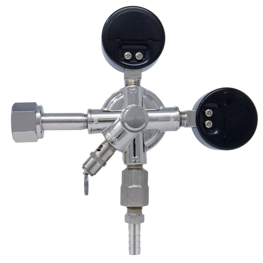 Dual Gauge regulator shows you working pressure and tank pressure Chrome plated brass body Manual pressure release valve and pressure adjustment knob Integral safety pressure relief valve releases at 45 psi