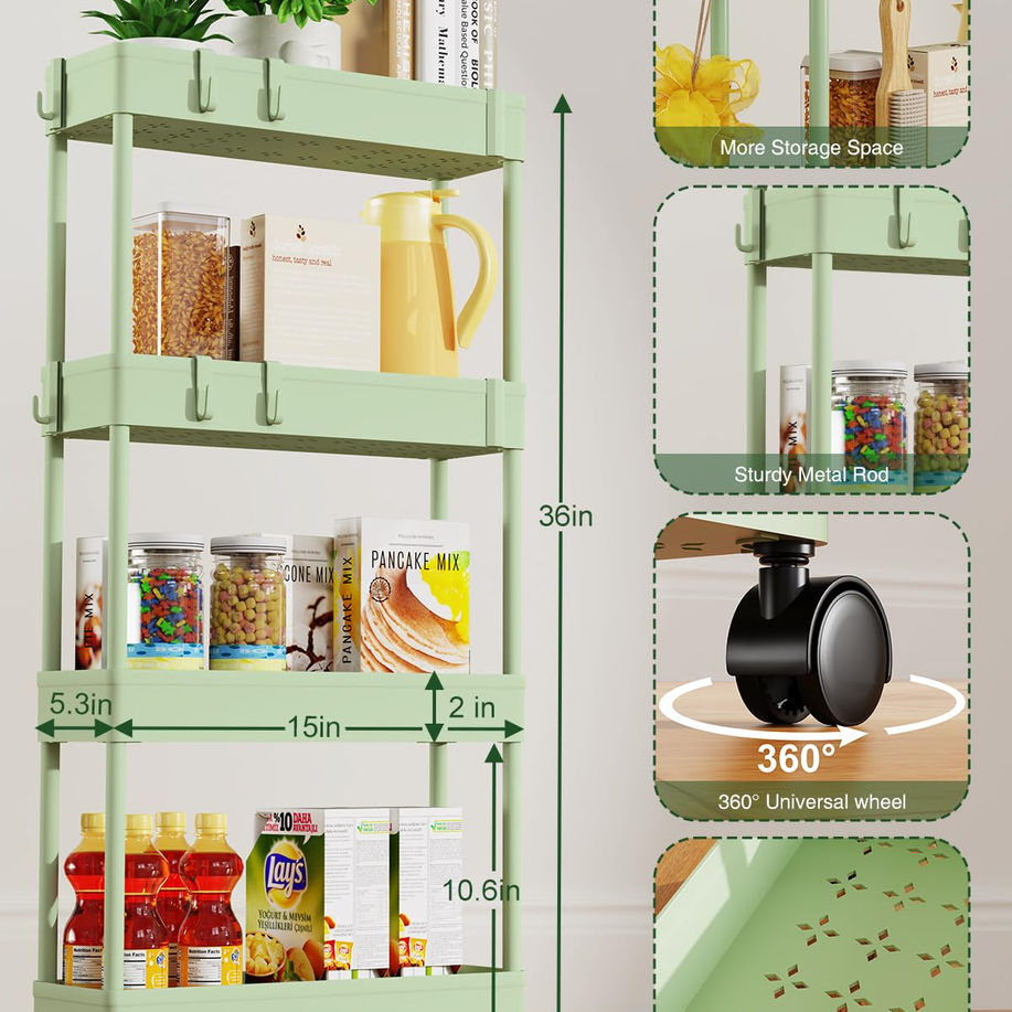 Flexible 4 Tiers Storage Cart: With a width of just 5.3 inches, this slim storage cart can be used in different tight spaces in your home. Ideal freestanding space saver for kitchen, classroom, bathroom, rv, restroom, laundry room, office, dorm, apartment or in-between your washer and dryer. 360° Movable Wheels: Sturdy construction and 4 durable casters make it easy to be pulled in and out from skinny spaces. The narrow laundry cart also comes with 6 hooks for extra storage. Multifunctional Utility Cart: The 4-tier rolling cart can not only be used in the kitchen to store vegetables, fruits, spices and tableware, but also can be used in the living room to store snacks, books and sundries. It can also be placed in the bathroom to store towels, shower gel, cosmetics and toiletries. Mesh hollow design: The bottom of the kitchen cart with wheels adopts a mesh hollow design, which farewell to the residual water during use, and also ensures air circulation. Sturdy and Durable: The rolling organizer cart is made of high-quality metal tubes and thickened plastic material. Every shelve has high guardrails on all sides to keep the shampoo, conditioner, soap and other items inside in place and prevent them from falling. The whole slim rolling storage cart can hold 35LB in total, please note that the lower layer should bear more weight than the upper layer to ensure the stability.