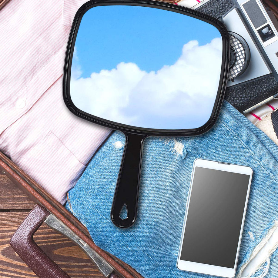 1X REGULAR HAND HELD MIRROR: Single-sided glass makeup mirror with no magnification, no distortion BIGGER VIEWING AREA: large hand mirror reflective surface. You can see your face and the back of your head at a glance. Perfect barber mirror for self hair-cut and hair styling PREMIUM HAND MIRRORS WITH HANDLE: This black mirror made of four layers of coating craftsmanship glass, so it will bring you a better reflection than other mirrors. And the backside is waterproof & skid-proof, which can be used in the bathroom or outdoor TRAVEL SIZE & STREAM-LIKE SHAPE: Only 6.6 oz weight. Super lightweight, easy to hold & portable. No burden when carrying outdoors. The frame is classic black has a rounded, rectangle shape TWO WAY FOR USE: It can be handheld or hang on the wall to use. Not only good for salon hairstylists to show clients their new hairstyle from all angles. Also, it can release your hands when shaving, tying a ponytail, or doing a French braid, etc