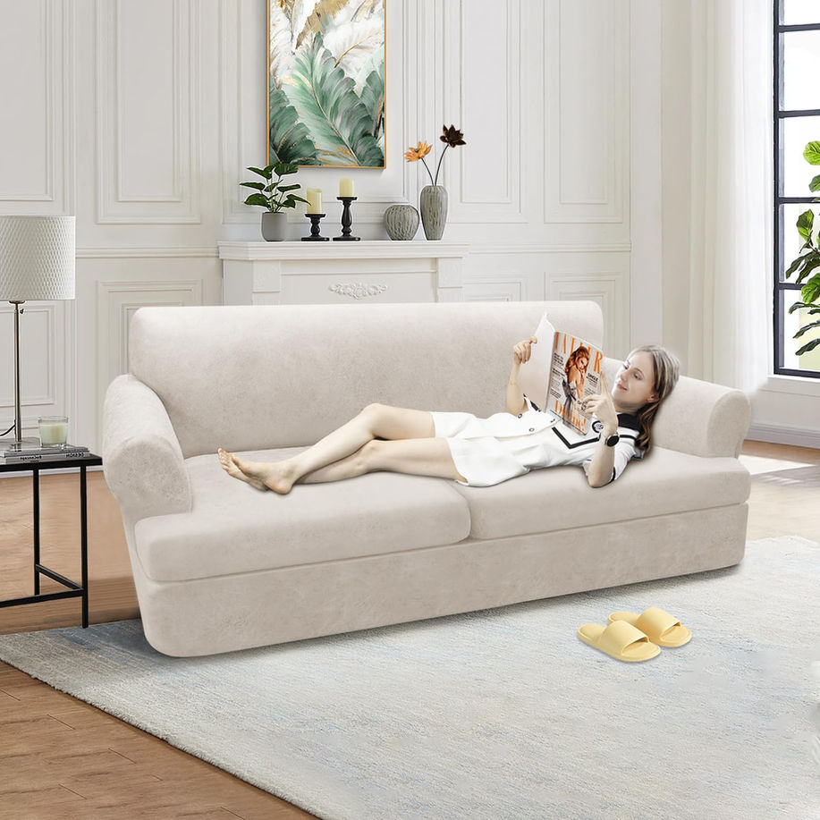 NEW LEATHER LOOK: The newest material is made of high quality polyester and spandex, the T cushion couch cover has the texture of leather and looks like leather, but it is more breathable, soft and stretchy than traditional leather fabric. Our couch covers for sofa are also practical and stylish, and it will be a great choice for all seasons. EASY TO REMOVE: Our 3-PIECES couch covers are very durable and include a base sofa cover and two individual t-cushion seat covers. The bottom elastic band that both keeps the cover in place and makes it easy to remove when you need to wash it. The high stretch fabric fits snugly on the sofa without wrinkling or shifting. T Cushion Design: Each package contain 2 t-shaped cushions covers. t-shaped cushion: 27-35" length, 22-30" width and 3-6" height. Best fits sofas 58-66 inches wide. PROTECT OR RENEW? The answer is all of them! sofa cover wraps around your couch 360° to protect it from everyday wear and tear, children's accidents, and dog digging into a sofa, while the contemporary look helps you style your furniture. WASH & CARE INSTRUCTIONS: Machine wash in cold water, use mild laundry detergent and wash separately. Non-chlorine bleach when needed, gentle cycle, do not iron, tumble dry at lowest heat setting. We attach great importance to your shopping experience, please feel free to contact us with any questions, we sincerely welcome your letter.