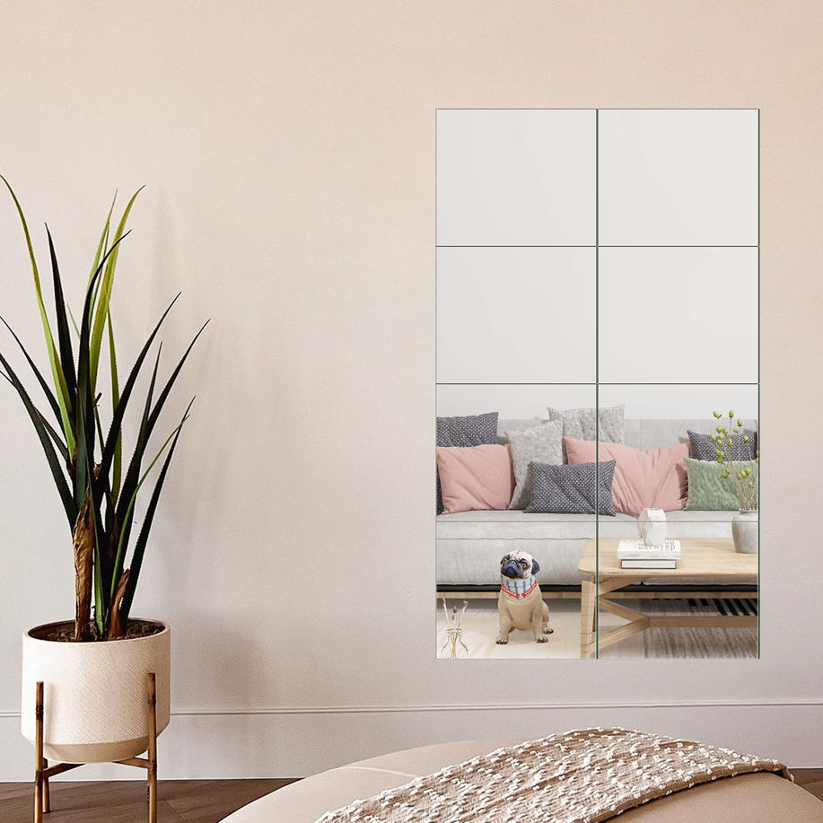 MIRROR SIZE - Set of 8 frameless real glass mirrors, each mirror tile is 12 x 10 inch. Advanced polishing technology makes safe and delicate edges HIGH-QUALITY - Gym Mirror Tiles are made of HD float glass, frosted edge protects well your hands DIY FREE DISPLAY - Can be combined as you wish, whatever square, rectangle or in other shapes, to make your home more elegant and warm. Perfect as door mirror, body mirror, Gym mirror, dance mirror and home décor EASY INSTALLATION - Package coming with powerful double sided foam tape. It can be easily installed on smooth walls, latex paint walls, light-hole tiled wall furniture or wooden doors, but not for wallpaper, blistering wall, ash-falling wall, moistured wall, uneven wall. After fixed, do not move at will WARM TIPS: These mirror tiles may distort the image if they are mounted on an uneven surface, so please confirm the walls are flat before purchasing. If you need a higher quality fitness mirror, our 24"x48"x2pcs large activity gym mirror may be more suitable for you, which can be used in more scenarios
