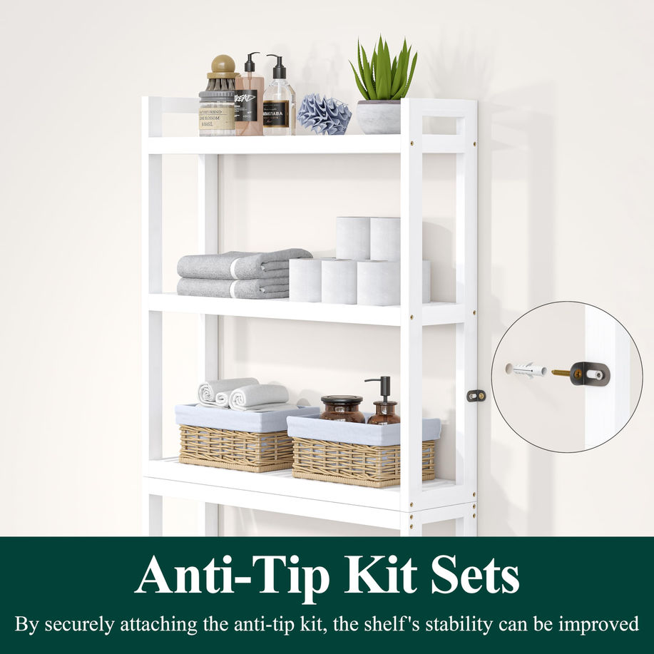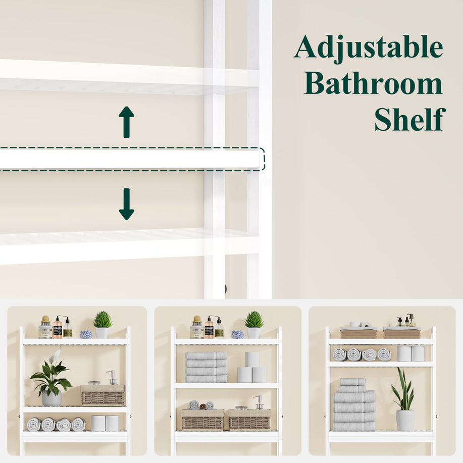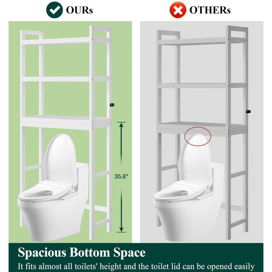 3-TIER OVER THE TOILET STORAGE: This over-the-toilet shelf is a great way to maximize the space in your bathroom with its 3 shelves, and 4 hooks. It makes it easy to access towels, tissues, or makeup without taking up extra floor space ADJUSTABLE ABOVE TOILET ORGANIZER: The middle shelf of this over-the-toilet organizer can be adjusted to 3 heights to hold shampoos or toilet papers, It is a great idea to tidy shower gels, towels, hairdryers, and plants STABLE BATHROOM SHELF: By securing bathroom shelf to the wall with the ant-tip kit, this over-toilet bathroom organizer can stay stable without tipping or wobbling. Each layer has a weight capacity of 33 pounds, resulting in a total weight capacity of 99 pounds FIT FOR MOST TOILET: The 35.8" height bottom bathroom storage cabinet fits almost all toilets' height and the toilet lid can be opened easily. In addition, the bottom bar can be set either 3.7” or 6.5” away from the floor to fit various toilets STORAGE ORGANIZER SHELF: Set it in a living room or verandah, can be used as a storage shelf. This over-the-toilet shelf organizer sized 10.2" D x 24.8" W x 69" H