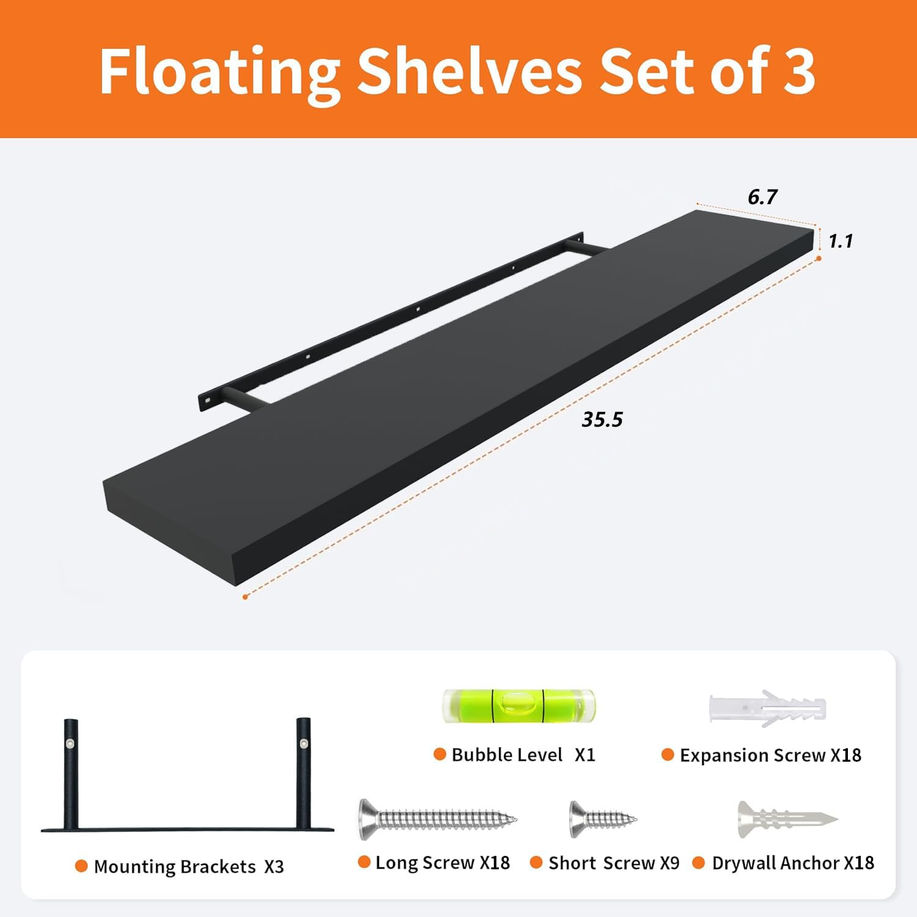 【Black Long Floating Shelves】These floating shelves for wall are made of engineered wood materials, which adds warmth and natural atmosphere to your space. Our wall-mounted floating shelves feature a smooth surface finish, adding a touch of vintage charm and contemporary style to our products. 【Space-saving】The floating shelves are an ideal choice for utilizing vertical space. The wall shelves can be easily installed on the wall without occupying floor space, effectively utilizing the vertical space in the room, making your space more tidy and orderly. 【Easy to Install】These floating shelves have clear and easy-to-understand installation guidelines and are equipped with hardware required for installation, reducing the trouble during the installation process. You can easily install the wall shelves according to the guidelines, without professional skills or special tools. 【Sturdy & Durable】The floating shelves are made of high-quality engineered wood and metal materials, ensuring sturdiness and durability. The wall shelves have a high load-bearing capacity and can safely carry heavy objects such as books, decorations, etc., and have a long service life. 【Multi-functional Applications】These floating shelves provide multiple uses and can be used in various rooms and scenes. You can use these floating shelves for wall in the bedroom, living room, office, bathroom, kitchen, as display shelves, storage shelves, photo display shelves, small plant display shelves, etc., to provide an orderly and beautiful space for your items.