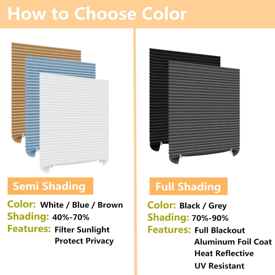 【Easy to Install】Stick on blinds are installed in just three steps - cutting, tearing and pasting. Blinds come with 2.5cm wide strong viscosity double-sided tape. No drilling, no falling off, no holes, and no damage to the wall and window. Easy to remove, and no stains leaving 【Premium Material】Our paper blinds are made of thicken high quality non-woven fabric, waterproof and dustproof, nontoxic and breathable. White, blue, brown colors are for light filtering, black and grey colors are for blackout and UV resistant 【Cut To Size】Perfect fit blinds for windows and doors, easy to cut to any size and shape, to fit your windows. Suitable for windows or doors of various sizes in bedroom, kitchen, bathroom. Carton packaging to avoid creases and distortion during transportation 【Clip On Adjustable】Each temporary blind comes with two clips, for you can easily adjust the height of the shade. Cordless design, suitable for families with children and pets, guarantees the safety of your family 【Product Size】Window blind measures (width x length): 35 x 59 inches, fits window 24-35 inches wide, and 39-47 inches high. Please note blinds are pleated, choose blinds with length greater than window height. If you are not sure which size to choose, please tell us the window size, we will reply to you within 12 hours